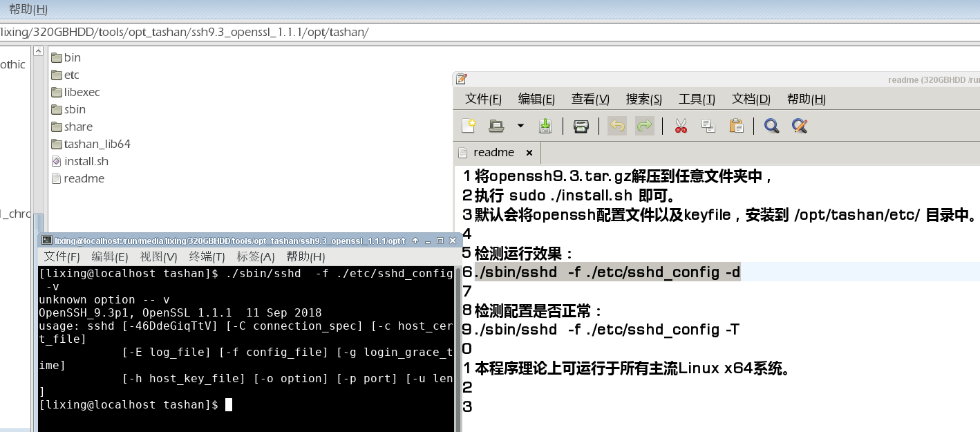 我们附赠的软件中有ssh9.3_openssl_1.1.1 ,解压就能运行,所需配置工作都写在./install.sh脚本中.运行一个即可. 支持所有主流x86_64 Linux系统.